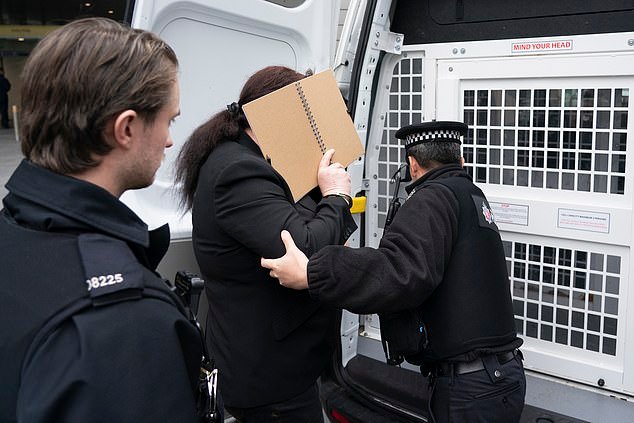 Były funkcjonariusz policji Lynsay Watson zakrywa twarz podczas aresztowania przed Centrum Sprawiedliwości Cywilnej w Manchesterze, 12 lutego 2026 r.