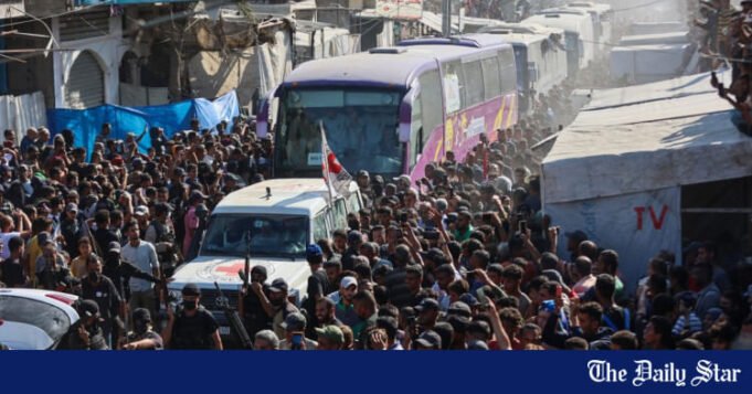 Autobusy przewożące Palestyńczyków zwolnionych z izraelskich więzień w ramach zawieszenia broni w Gazie i umowy o wymianie zakładników z frakcjami palestyńskimi przyjeżdżają przed szpital Nassera w Khan Yunis w południowej Strefie Gazy 13 października 2025 r. (Zdjęcie: Omar AL-QATTAA / AFP)
