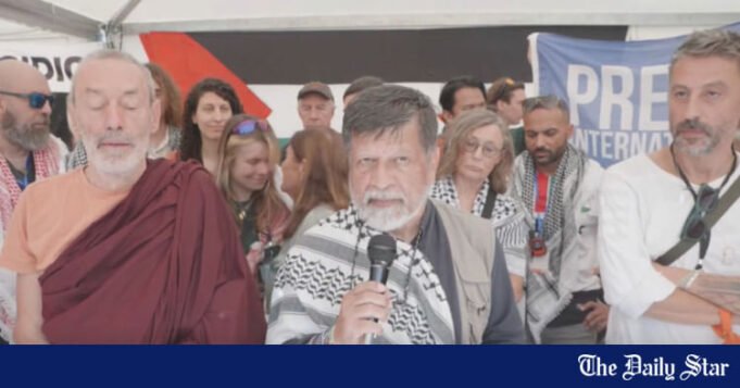 „Jestem tutaj wraz z 180 milionami Bangladeszu, z których wszyscy jednoczą się: Palestyna będzie wolna” – powiedział.