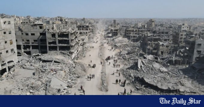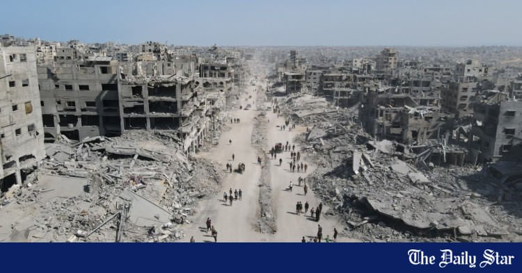 Na tym zdjęciu z lotu ptaka ludzie spacerują pośród zniszczeń w mieście Gaza w północnej Strefie Gazy 11 października 2025 r., dzień po wejściu w życie zawieszenia broni. Foto: AFP