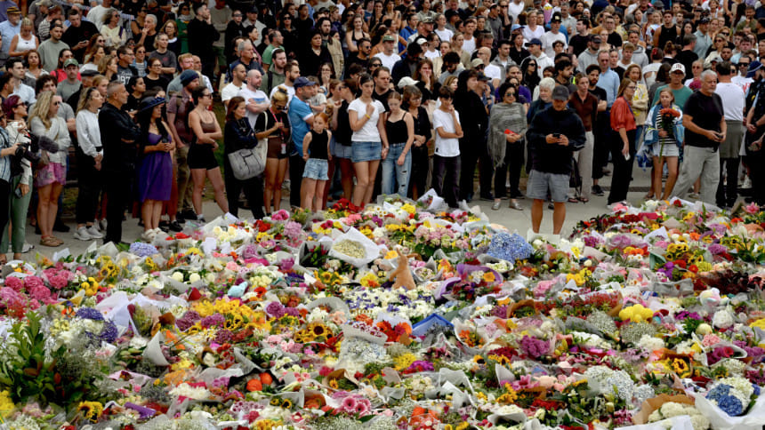 Żałobnicy składają kwiaty w pawilonie Bondi ku pamięci ofiar strzelaniny na plaży Bondi w Sydney 15 grudnia 2025 r. Ojciec i syn otworzyli ogień podczas festiwalu żydowskiego na australijskiej plaży Bondi w wyniku strzelaniny, w wyniku której zginęło 15 osób, w tym dziecko, podały 15 grudnia władze, potępiając atak jako antysemicki „terroryzm”. Foto: AFP