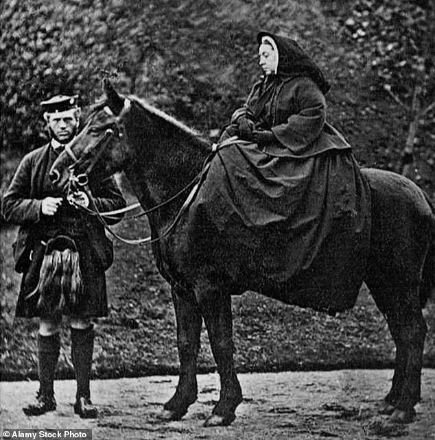 Królowa Wiktoria ze swoim „towarzyszem” Johnem Brownem na koniu „Fyvie” zrobionym w Balmoral w 1863 r.