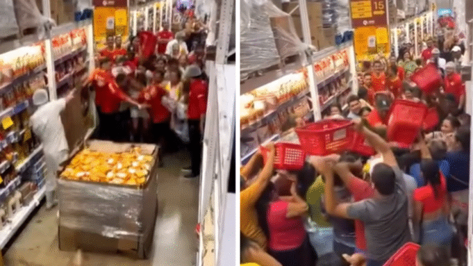 Spójrz na chaos… supermarket w Assu w Brazylii zamienił się w darmowy sklep, w którym klienci przepychali się, przepychali i wspinali się na siebie, aby złapać tanie opakowania makaronu, które zniknęły dosłownie w 3 minuty.