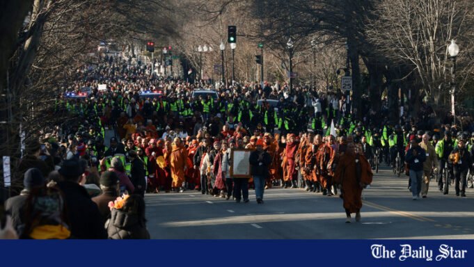 Dwudziestu mnichów buddyjskich, odzianych w szaty w kolorze spalonej pomarańczy, przybyło we wtorek do Waszyngtonu w ramach „Walk for Peace” liczącego 3300 km, będącej samozwańczą duchową podróżą przez dziewięć stanów, którą wiwatowały tysiące tysięcy ludzi.