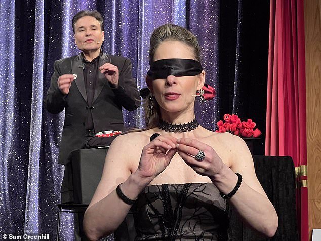 Magik Marc Oberon i Emily Yarrow. Z zawiązanymi oczami odgaduje przedmiot w dłoni Marca. To zdjęcie zostało zrobione kilka minut przed wykonaniem tej samej sztuczki – ale z pierścionkiem zaręczynowym