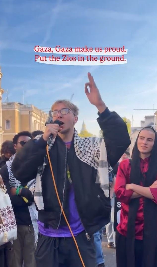 Sfilmowano studenta Oksfordu (na zdjęciu), który skandował „przerażające” antyizraelskie teksty do tłumów w Londynie, co spowodowało wszczęcie dochodzenia policyjnego