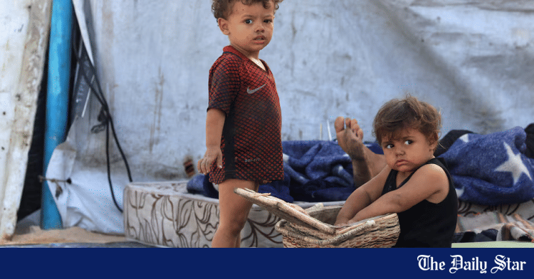 Przesiedlone palestyńskie schronienie dla dzieci z boku Raoda, po tym, jak Hamas zgodził się zwolnić zakładników i zaakceptować inne warunki w amerykańskim planie zakończenia wojny, w Central Gaza Strip, 4 października 2025 r. Reuters/Dawoud Abu Alkas