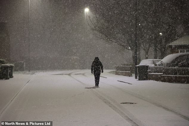 Dziś wczesnym rankiem w Newcastle osoba spaceruje po śniegu w warunkach białej pogody