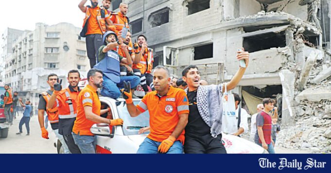W Gazie, gdzie większość z ponad 2 milionów ludzi została przesiedlona w wyniku izraelskich bombardowań, młodzi mężczyźni klaskali na zdewastowanych ulicach, mimo że izraelskie strajki trwały w niektórych częściach enklawy.