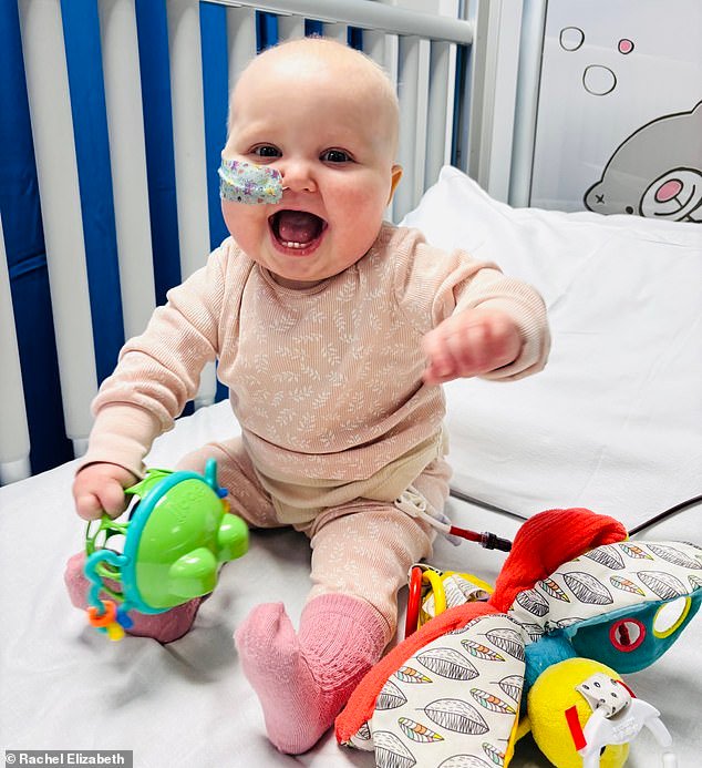 Melody na zdjęciu z rodzicami Rachel (po lewej) i Kevinem (po prawej), którzy twierdzą, że Revuforj „uratuje jej życie” po nawrocie choroby u niemowlęcia w październiku