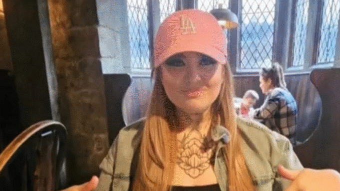 Go Fund Me June Bunyan - kobieta o długich czerwonawych włosach obok ramion i różowej czapce baseballowej - siedzi w pubie lub kawiarni i wskazuje na drinka i jedzenie przed nią.Finansuj mnie