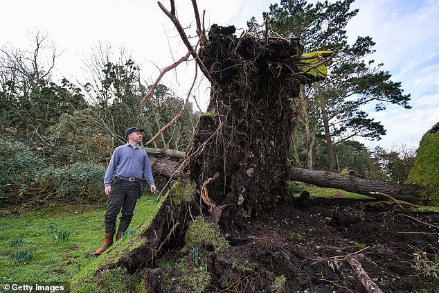 Starszy ogrodnik Jack Beesley stoi dziś obok przewróconego drzewa w St Michael’s Mount w Kornwalii
