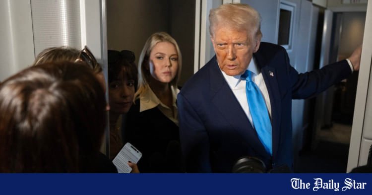 Prezydent USA Donald Trump przemawia na pokładzie Air Force One podczas podróży z Japonii do Korei Południowej, 29 października 2025 r. AFP