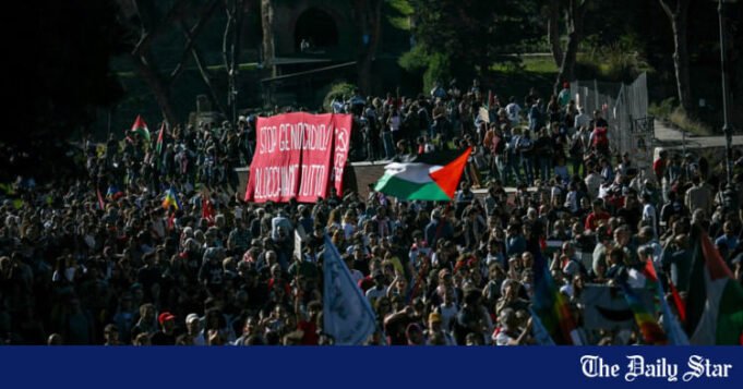 Protestujący we włoskiej stolicy, w tym rodziny z dziećmi, krzyczeli: „We Are All Palestyńczycy”, „Wolna Palestyna” i „Stop the Ludocide”, z wieloma niosącymi flagi palestyńskie i nosząc czarno-białe kratę keffiyehs.