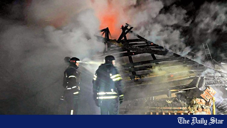 Zdjęcia opublikowane w Telegramie przez ukraińskie służby ratunkowe przedstawiają strażaków walczących z pożarem domu, a dym unosi się przez drewniane belki dachu.