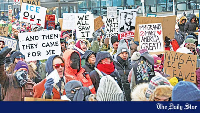 W obliczu wysokiego napięcia protestujący zebrali się w niedzielę w Minneapolis, potępiając egzekwowanie przepisów imigracyjnych i celnych (ICE). Jedna osoba trzymała kartonową tabliczkę z napisem: „Bądź Pretti, bądź dobry”.