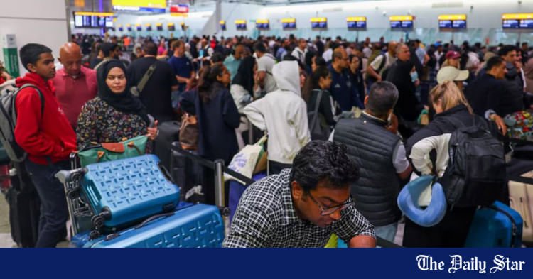 Mężczyzna używa smartfona jako kolejki Travellers do zameldowania w terminalu 4 na lotnisku Heathrow 4, po zakłóceniu systemów odprawy i wejścia na pokład spowodowany cyberatakiem, który wpłynął na kilka głównych europejskich lotnisk, co spowodowało opóźnienia w lotach i odwołania, w większym Londynie, Wielka Brytania, 20 września 2025 r.