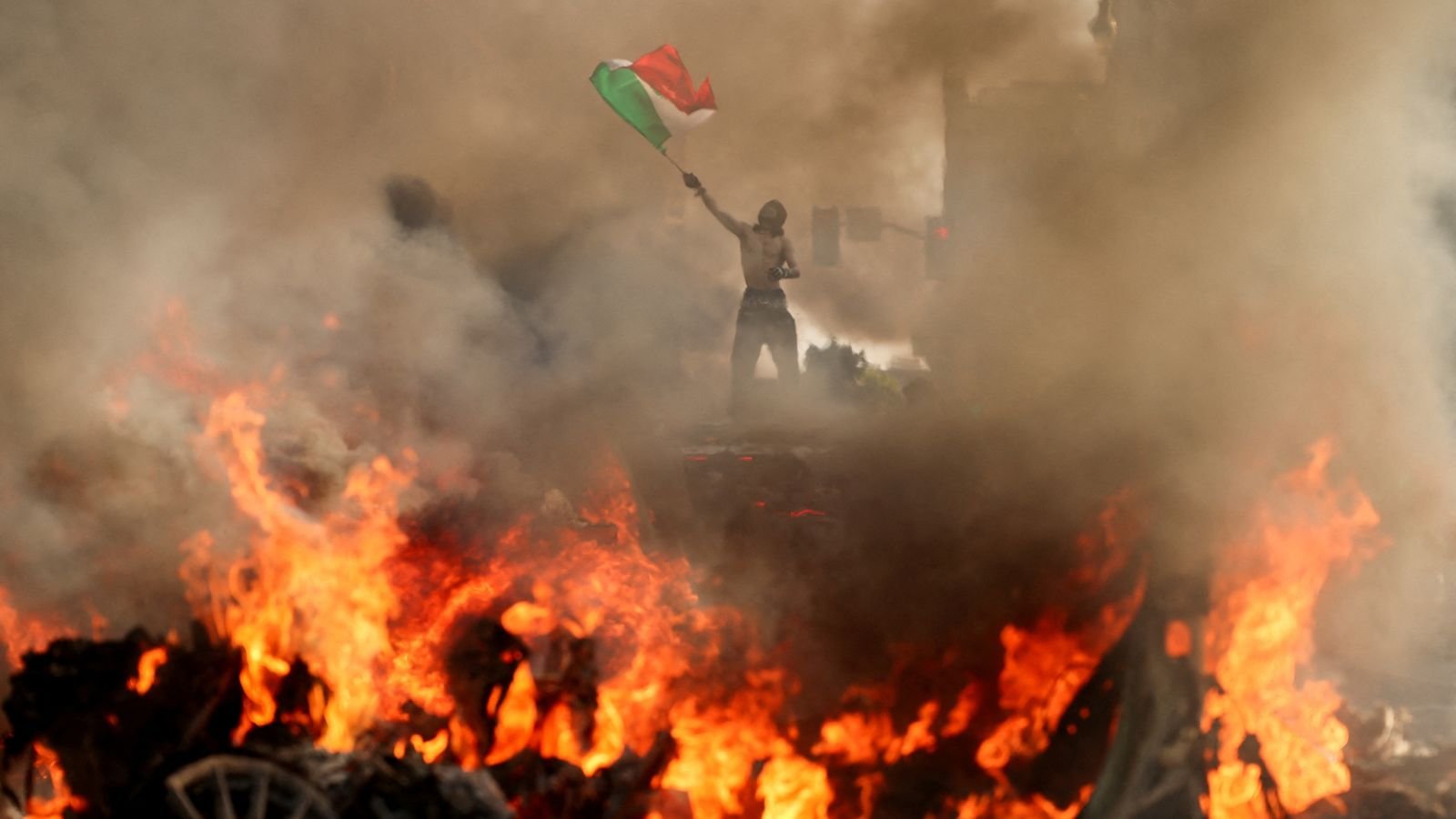Mężczyzna bez koszuli machający meksykańską flagą stoi na płonącym samochodzie w sercu Los Angeles, gdy inny mężczyzna rzuca stożka ruchu w płomieniach i niektórych bębnów i krzyków w opozycji do urzędników imigracyjnych.
