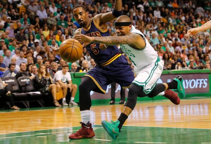 19 maja 2017; Boston, MA, USA; Obrońca Boston Celtics Isaiah Thomas (4) sięga po luźną piłkę przed obrońcą Cleveland Cavaliers JR Smithem (5) w pierwszej połowie drugiego meczu finału Konferencji Wschodniej play-offów NBA w TD Garden. Obowiązkowe zaliczenie: Winslow Townson – USA TODAY Sports