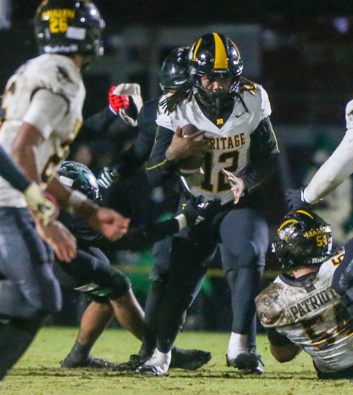 American Heritage QB Leon Strawder prowadzi piłkę podczas półfinałowego meczu piłkarskiego District 4A State na stadionie Choctaw.