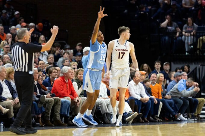 CHARLOTTESVILLE, WIRGINIA – 24 stycznia: Jarin Stevenson nr 15 z North Carolina Tar Heels świętuje rzut za trzy punkty przed Johannem Gruenlohem nr 17 z Virginia Cavaliers w drugiej połowie meczu w John Paul Jones Arena 24 stycznia 2026 r. w Charlottesville w Wirginii. (Zdjęcie: Ryan M. Kelly/Getty Images)