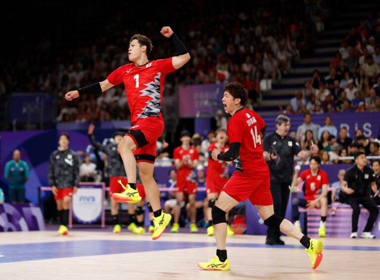 31 lipca 2024; Paryż, Francja; Japonia u boku Yuji Nishidy (1) uderza Argentyną podczas Letnich Igrzysk Olimpijskich w Paryżu w 2024 r. w South Paris Arena 1. Obowiązkowe źródło: Yukihito Taguchi-Imagn Images