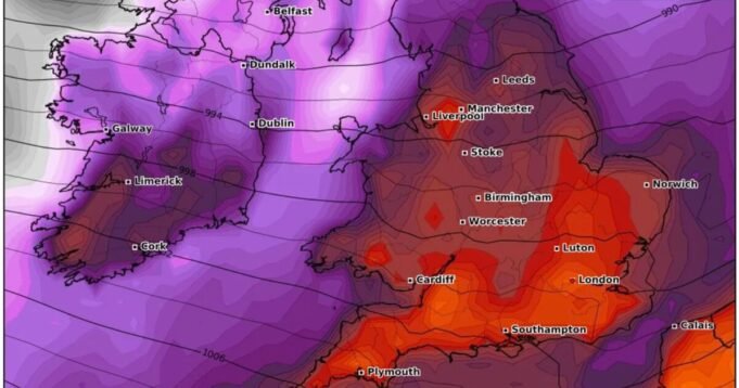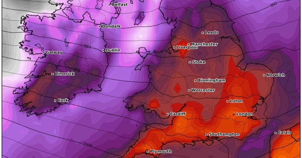 Wxcharts Prognozy ujawniają podmuchy wiatru do 88 mil na godzinę, które zmieniają się w części Anglii i Walii późno w piątek wieczorem do wczesnych godzin soboty. . System burz oczekuje się również uwolnienia 200-milowy ścianę deszczu rozciągając się od południowego zachodu przez Midlands i do południowo -wschodniej Anglii.