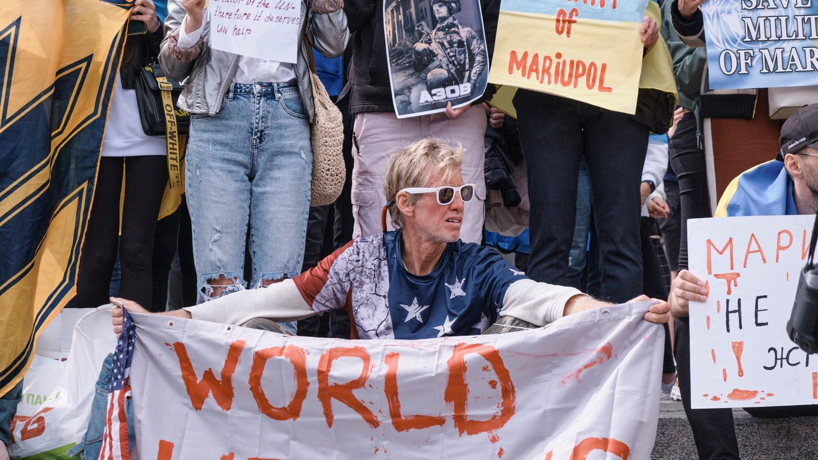 Ryana Routha można zobaczyć w maju 2022 r., trzymającego baner z napisem „Świat, pomóż nam” podczas demonstracji w Kijowie na Ukrainie. (Artem Gvozdkov/Global Images Ukraina za pośrednictwem Getty Images)