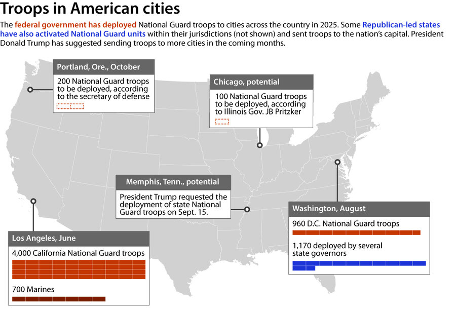Plany pana Trumpa odzwierciedlają jego wcześniejsze rozmieszczenie tysięcy członków Gwardii Narodowej w Blue-State California w czerwcu. Tysiące kolejnych w sierpniu wysłano do Demokratów Waszyngton, DC Prezydent zasugerował, że inne lewicowe miasta, w tym Chicago, mogą być następne.