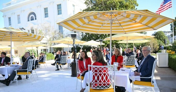 Prezydent był gospodarzem spotkania o godz świeżo odnowiony Ogród Różany Białego Domuktóry kontrowersyjnie przekształcił, układając kostkę brukową, aby stworzyć patio na takie okazje w lecie, wywołując ostrą krytykę po obu stronach podziału politycznego. Wartość projektu szacuje się na 1,9 mln dolarów.
