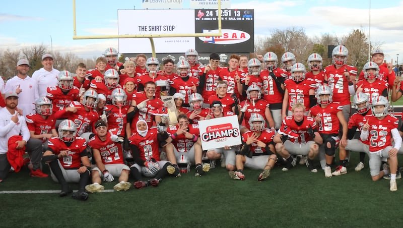 Kanab świętuje po zwycięstwie w mistrzostwach stanu 1A w piłce nożnej w piątek 14 listopada 2025 r. na Uniwersytecie Southern Utah w Cedar City. | Jeffa Richardsa