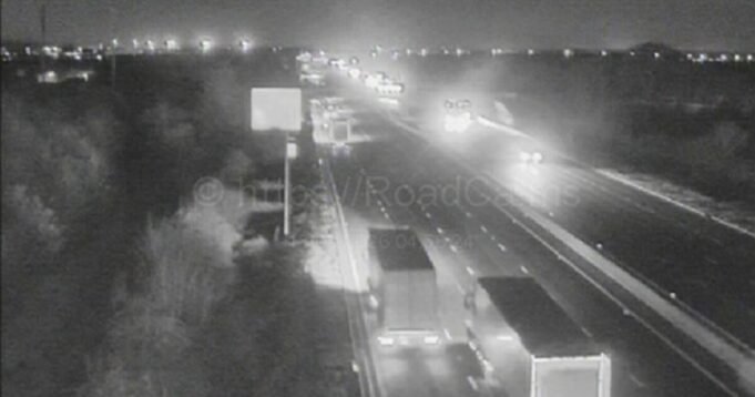 The M1 zamknięty w kierunku północnym między J12 (Flitwick) i J13 (Milton Keynes) przed porannymi godzinami szczytu w środę, 18 lutego.