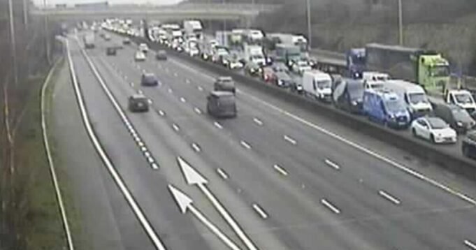 Władze National Highways podały, że przed godziną 9:30 kierowcy w okolicy mogą spodziewać się nawet 50-minutowych opóźnień. Zamknięte zostały dwa z czterech pasów ruchu.