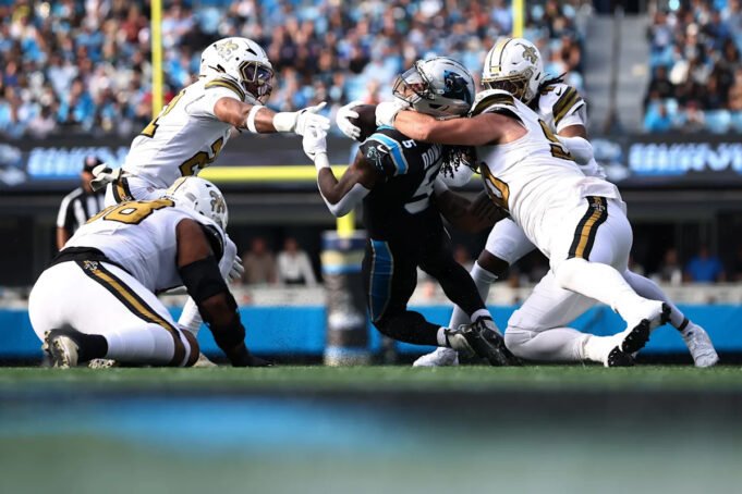 3 listopada 2024 r.; Charlotte, Karolina Północna, USA; Obrońca Carolina Panthers Chuba Hubbard (30) zostaje pokonany przez obrońcę New Orleans Saints Demario Davisa (56) w czwartej kwarcie na stadionie Bank of America. Obowiązkowe źródło: obrazy Boba Donnana-Imagn