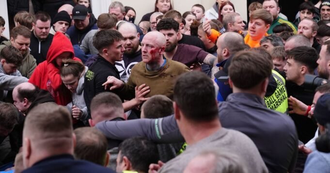 Tradycja historyczna stała się brutalna, gdy tysiące ludzi walczyło z nią na ulicach pewnego miasta Miasto w Wielkiej Brytanii w tym tygodniu. Rocznik Atherstone gra w piłkę, odbyła się tłusty wtorek przed Popielcemwidzi tłumy w miasteczku Warwickshire walczące o posiadanie specjalnie wykonanej skórzanej piłki, co powoduje chaotyczne sceny.