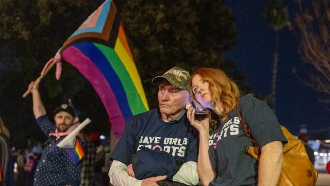 Zwolennicy transpłciowych sportowców trzymają transparenty przed czwartkowym wieczorem spotkaniem Riverside Unified School District, aby debatować nad prawem transpłciowych sportowców do rywalizacji w sporcie w szkołach średnich, czwartek, 19 grudnia 2024 r. (Allen J. Schaben/Los Angeles Times za pośrednictwem Getty Images)