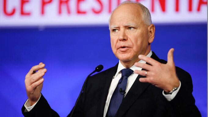 Gubernator Minnesoty Tim Walz przemawia na spotkaniu w ratuszu w DeYor Performing Arts Center, 7 kwietnia 2025 r. w Youngstown w stanie Ohio. Salę wypełniło 2600 osób, które mogły zadawać pytania i słuchać pomysłów gubernatora Walza. (Jeff Swensen/Getty Images)