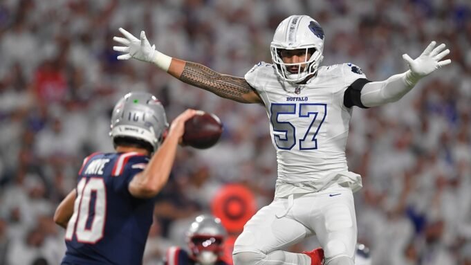 Buffalo Bils Defensive i AJ Appenesa (57) nowojorski Orchard Park w Nowym Jorku, niedziela, wrzesień 2025, rozgrywający New England Patriots Drake Mai (10) podczas pierwszej połowy meczu piłkarskiego NFL. (AP Photo/Adrian Crows)