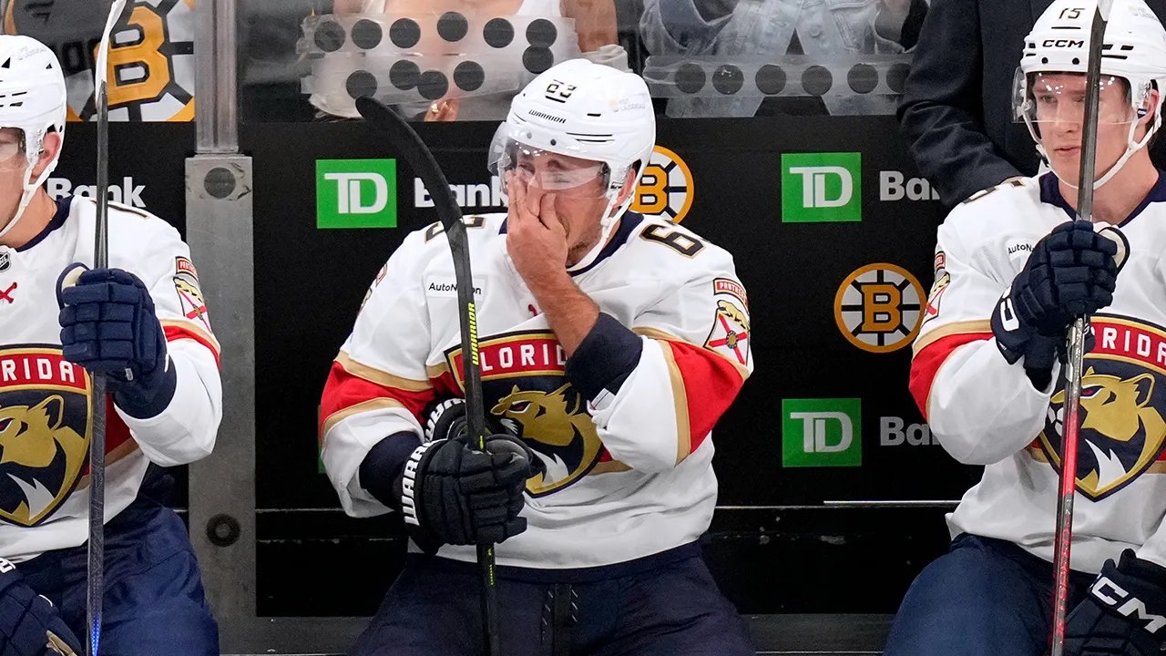Lewy skrzydłowy Florida Panthers Brad Marchand (63), który grał przez ponad 15 sezonów w drużynie Boston Bruins, reaguje podczas pierwszej przerwy w meczu hokejowym NHL 21 października 2025 r. w Bostonie w stanie Massachusetts. (zdjęcie Charlesa Krupy/AP)